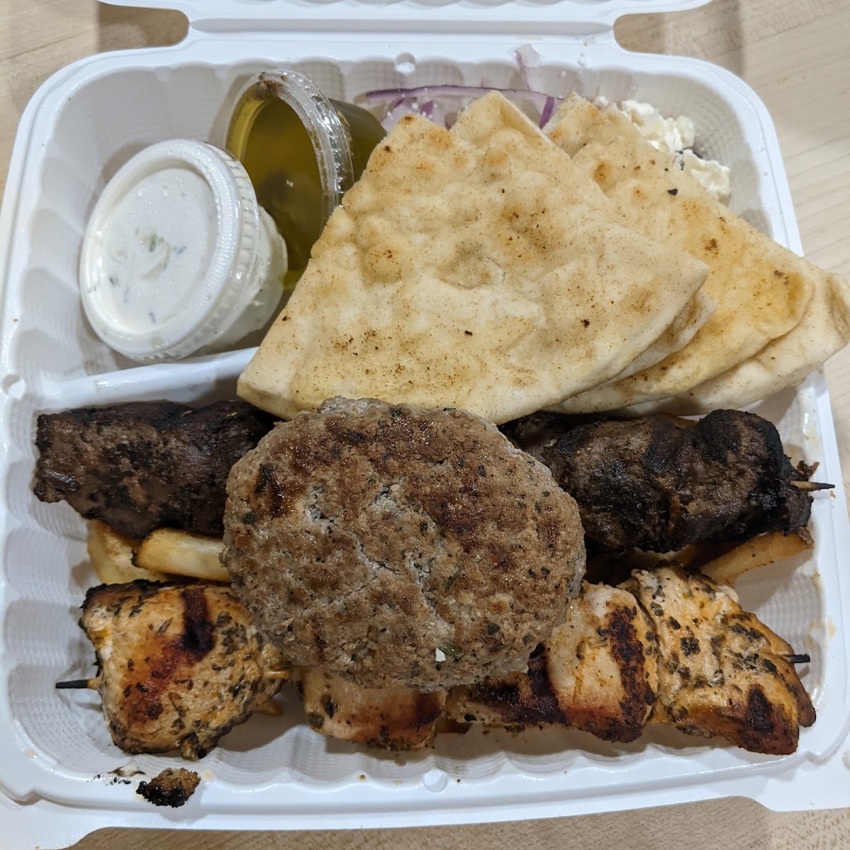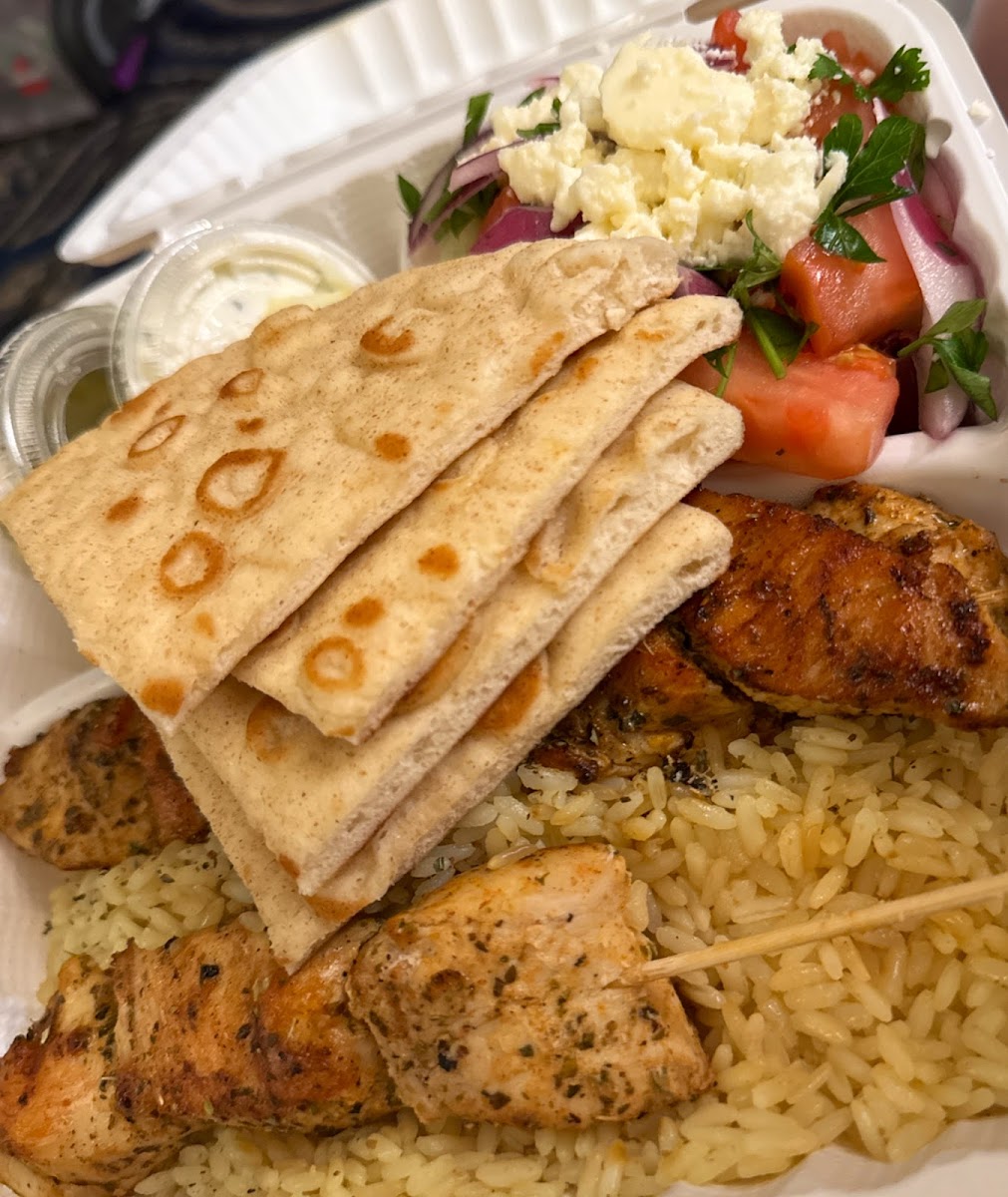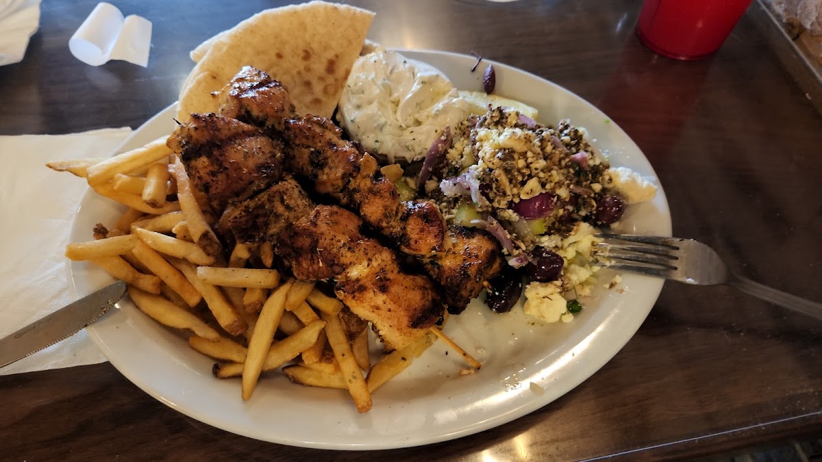 If you're looking for a vegetarian option, the Vegi Souvlaki Pita is sure to please. Skewered and grilled seasonal vegetables are served with the same delightful toppings, encapsulating the essence of Greek flavors. The addition of fluffy fries adds a comforting crunch that pairs beautifully with the tender veggies.